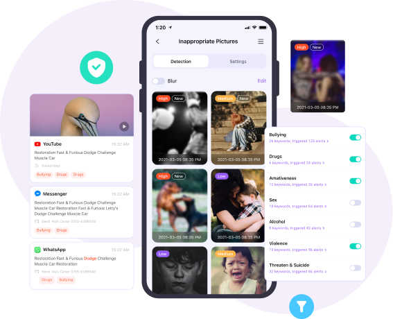 Gestione dei contenutiRilevamento e intercettazione personalizzati di parole e immagini sospette sui social media. Il modo migliore per controllare i telefoni dei bambini.