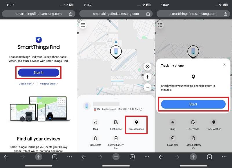 Search for the SmartThings Find website and press the Sign In button on an iPhone. Afterward, enter your Samsung Account credentials, and you will see your mobile’s location. Now, press the Track Location button and hit Start to check the movement of your missing phone every 15 Minutes.