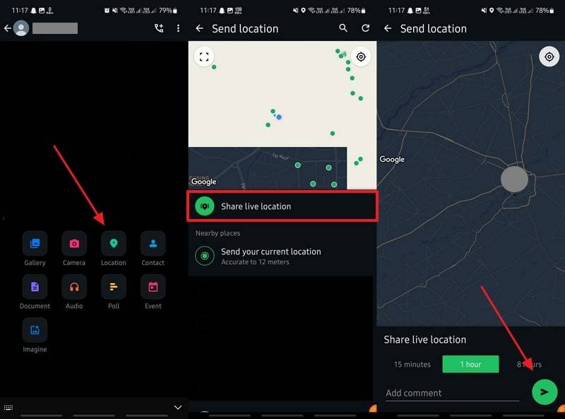 Step 1. To inaugurate, tap the Attachment icon and select the Location option from the chat menu. Upon seeing the new display, press Share Live Location, choose your preferred time and hit the Send button.