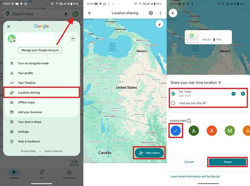Step 1. Launch the app from your iOS device and select your Profile icon. When a menu appears, access the Location Sharing feature and tap the New Share . option. Now, after selecting the duration and the person to share with, press the Share button.