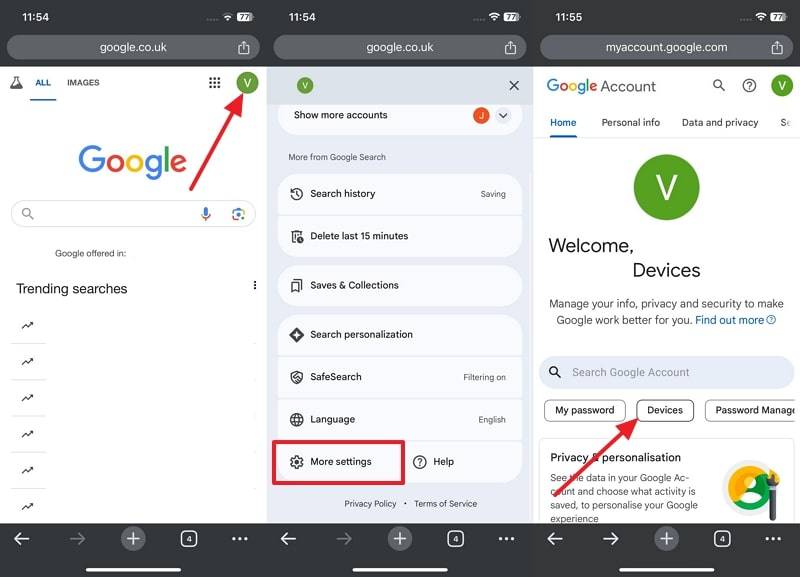 Step 1. Reach the Account Icon on your device and scroll down on the next screen to select More Settings. You will find the Devices option, leading you to the devices that were logged in with this account.