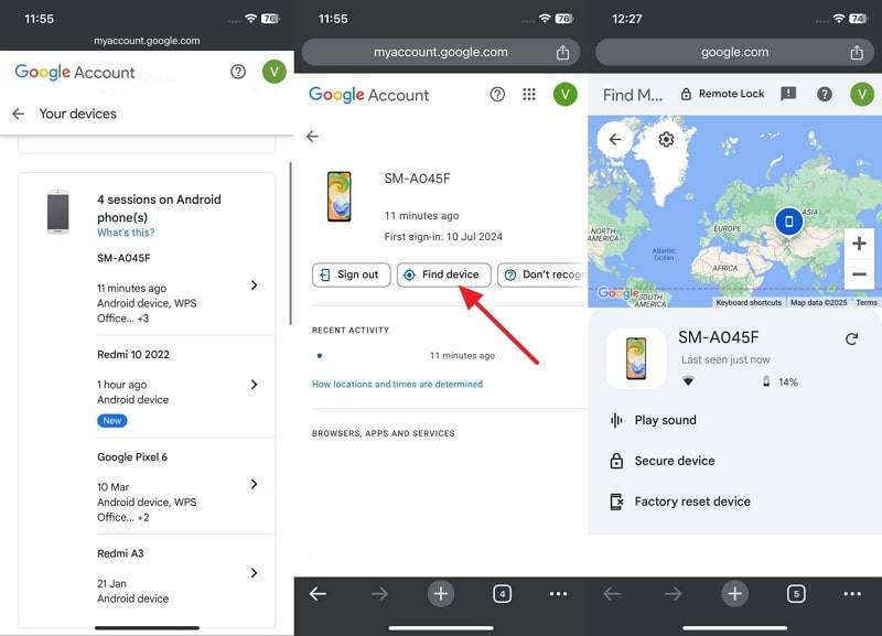 The above method may not work in certain situations, such as when your phone is lost or stolen. Google Find My Device is another way that can help you track Android phones from the iPhone. You can not only locate the device and even erase its data if you have an active internet connection. By following the given steps, you can easily find your lost device:
