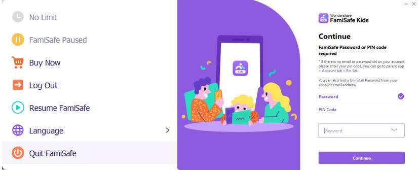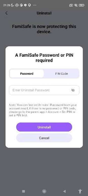 Step 3: Enter your FamiSafe account password. You can choose to enter your own FamiSafe account password (the credentials used to log in to the parent's app), or you can enter the PIN code that has been set in the parent's app (found at: Account—>PIN set).
