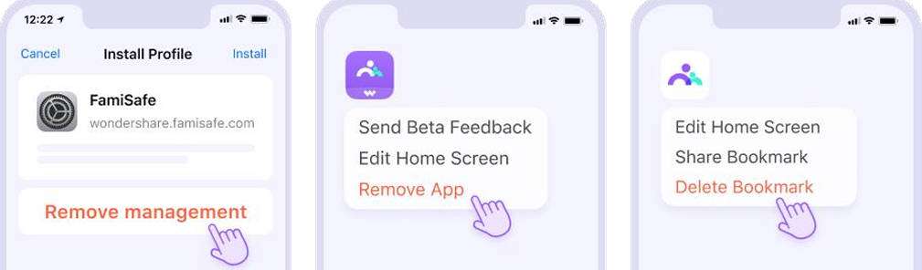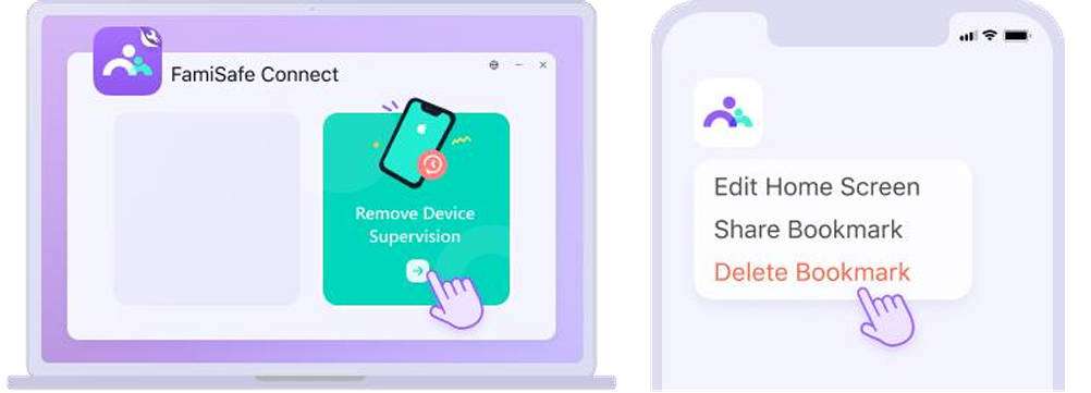 Never used FamiSafe Connect on the computer for upgrading supervision. First, you need to delete the FamiSafe profile in Settings > General > Device Management menu. Then if the Fammy icon still appears on the home screen, you can uninstall it by longpressing. If there is a white icon (web bookmark) also, delete it in the same way.