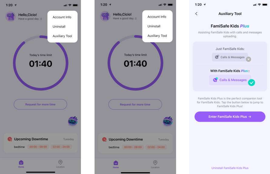 After entering Fammy, tap the settings button at the top right corner, select "Auxiliary Tool", and enter the parent's account password or the Pin code to unlock the parent's app. You will then see the button to uninstall Fammy Plus.